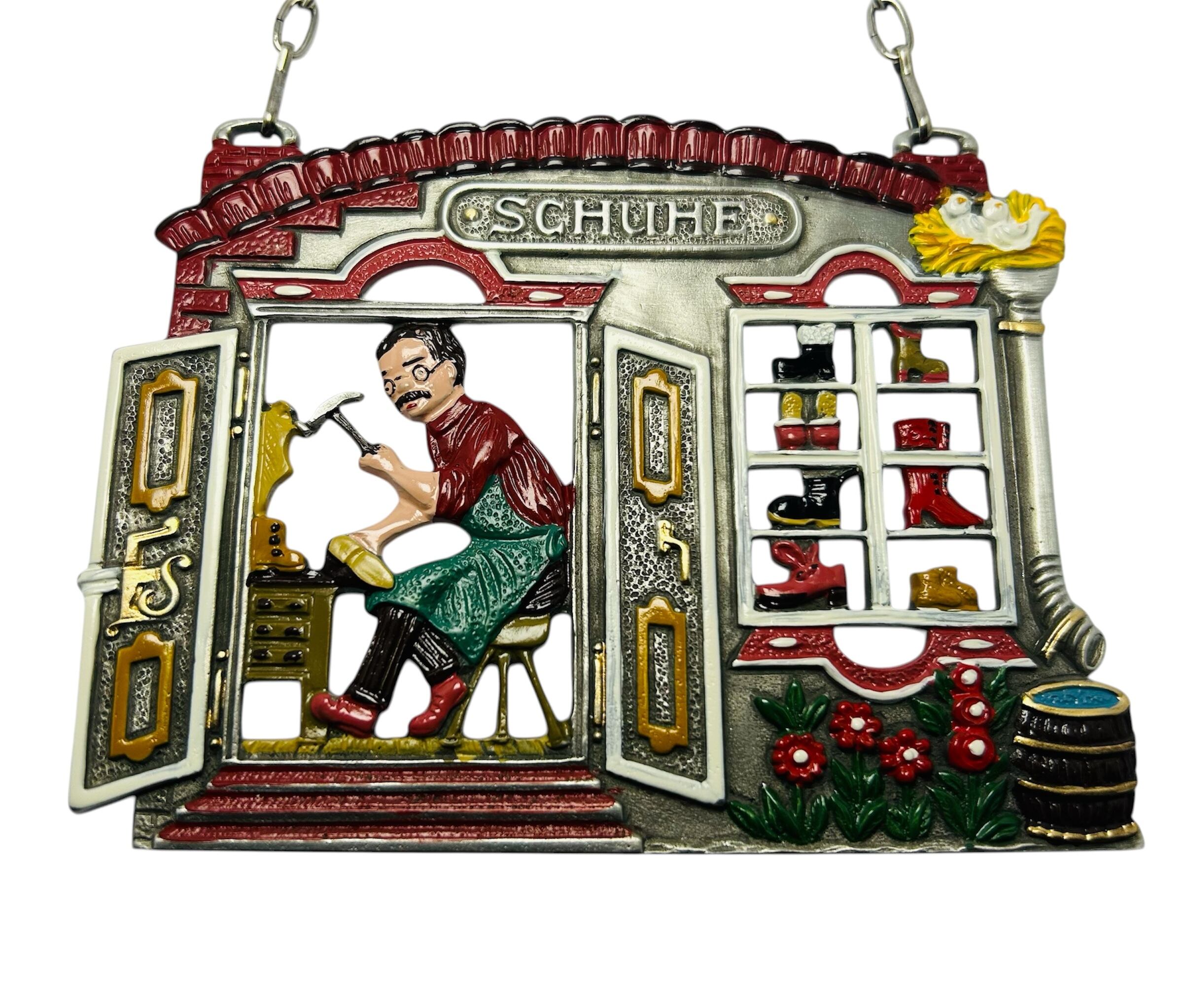 ドイツの靴屋をモチーフにした錫(すず)製の壁飾りです。