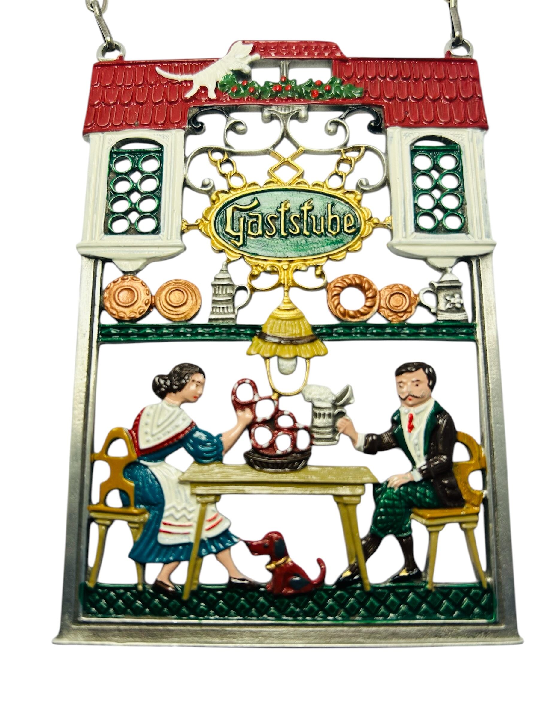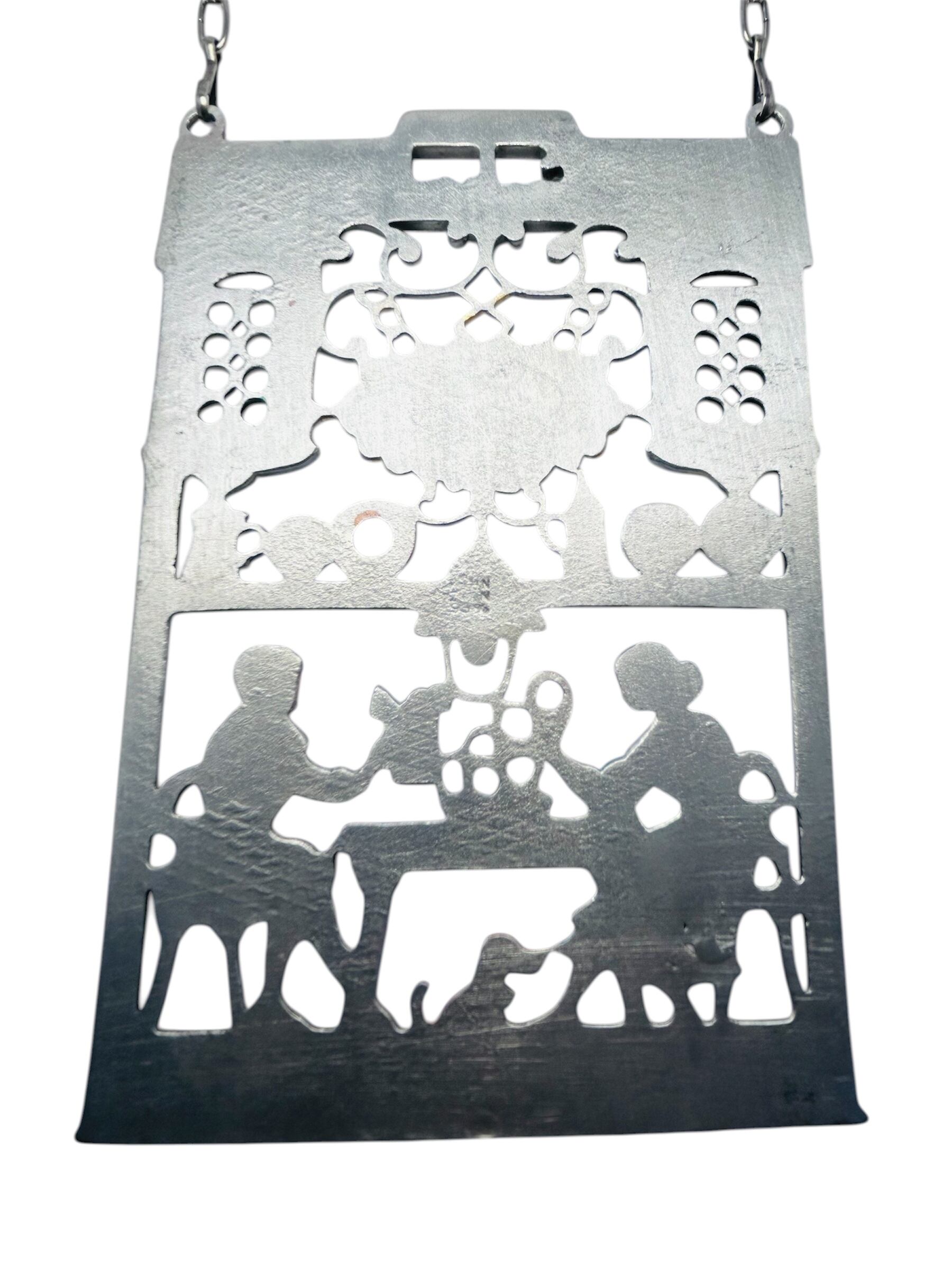 食堂で向かい合い、食事を楽しんでいる二人を描いた錫(すず)製の壁飾りです。